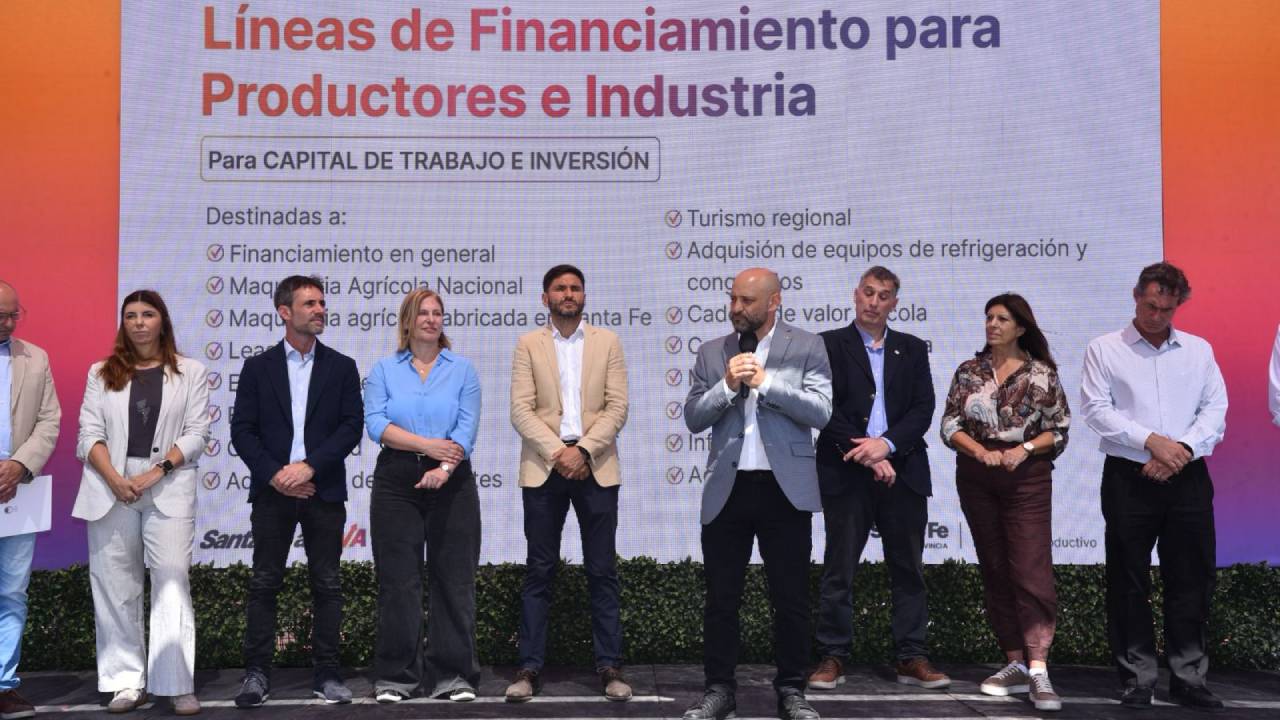 El gobernador Maximiliano Pullaro y los ministros de Desarrollo Productivo, Gustavo Puccini, y de Economía, Pablo Olivares, presentaron este martes en Expoagro cupos de financiamiento por más de 145.000 millones de pesos para activar la producción santafesina.
