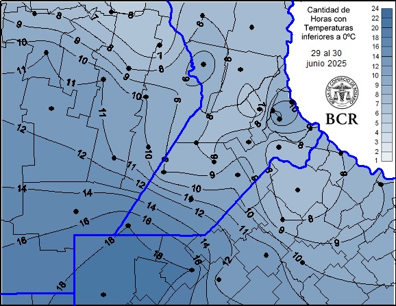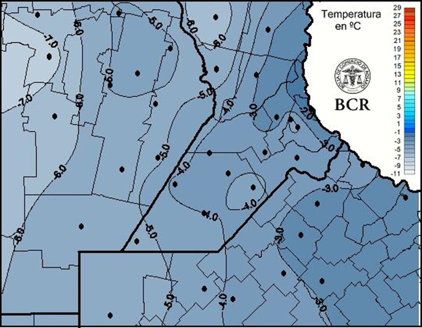 “Estamos viendo registros de temperaturas muy por debajo del cero”, señaló Cristián Russo, responsable de la Guía Estratégica para el Agro de la Bolsa de Comercio de Rosario. En localidades como Hernando se llegó a los -7,5 °C, en Montes de Oca a -6 °C y en Carlos Pellegrini a -7 °C. En Rosario, el termómetro marcó -0,8 °C. Pero también ha sido muy notable la persistencia del frío: “Villegas estuvo 19 horas por debajo del cero en las últimas 24 horas registradas. Rufino y General Pinto, 18 horas. En Rosario, también se superaron las 10 horas bajo cero”, precisó Russo.