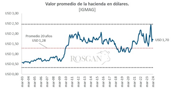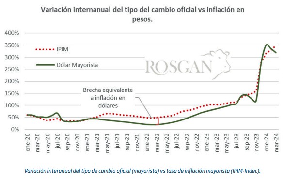 El mercado de Rosgan analizó este contexto y planteó que la política cambiaria del gobierno nacional genera un retraso en el precio del dólar en comparación con la inflación. “Aun con signos de incipiente moderación, sigue siendo muy elevada. La estimación de inflación para el primer trimestre ronda los 50 puntos porcentuales contra un tipo de cambio oficial que de diciembre a la fecha solo ha avanzado en 4,5 %. Incluso, tomando el llamado dólar exportador, el cual pondera en un 20 % la cotización libre (CCL), su performance solo se ve mejorada hasta un 6 %”, planteó el informe.